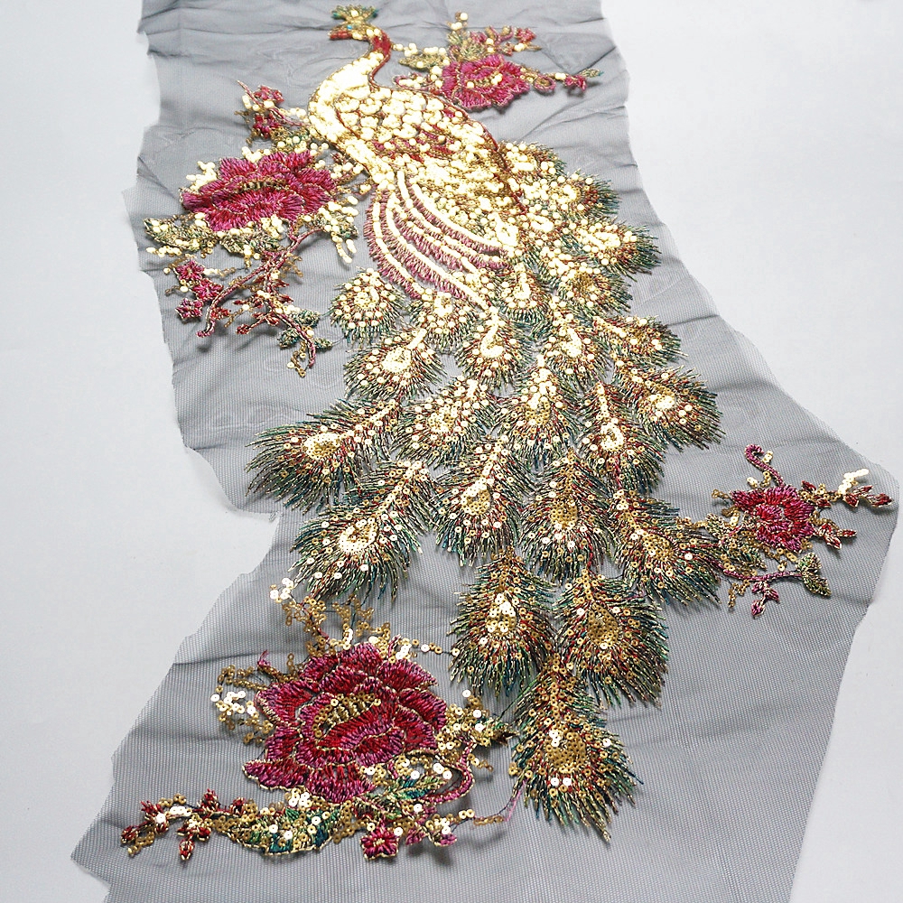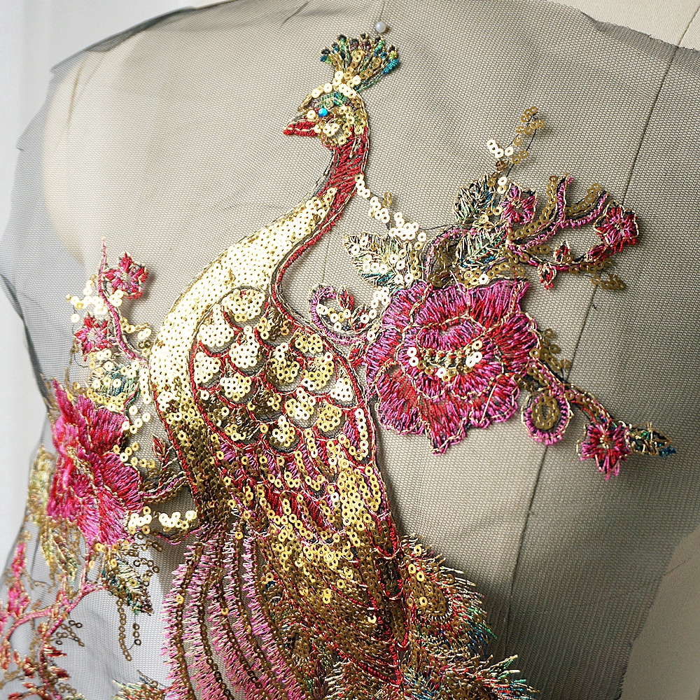 Vải tuyn màu đen thêu hình chim công đính kim sa độc đáo dùng may áo cưới free ship